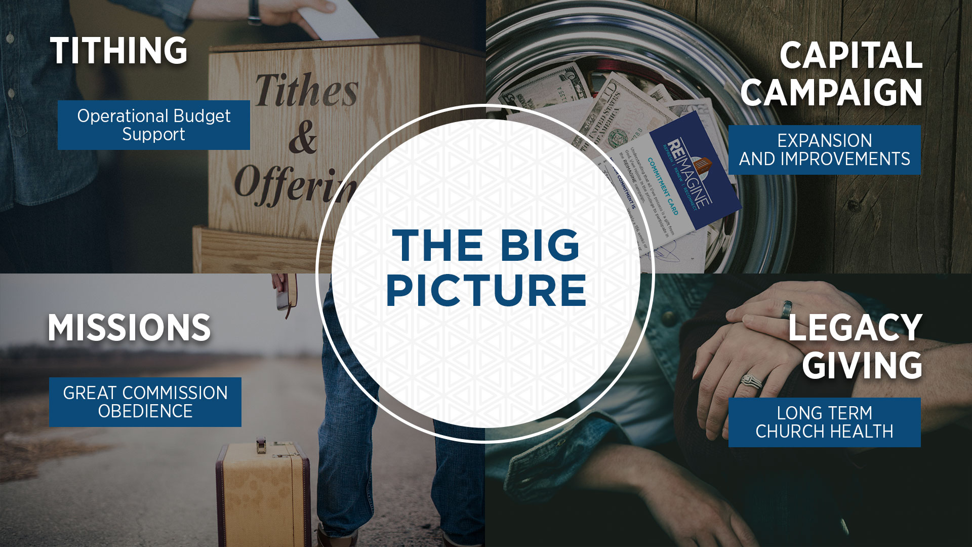 Too often, church capital campaigns under-perform because they are often one-off events and not seen or understood as a critical piece to an ongoing holistic approach to your church’s financial health. We want to equip and engage your church during a three-year term that transforms hearts and lifestyles mature and change. If a church is to expand its scope over time, church leadership must commit to implementing a Big Picture strategy designed around the four inter-connected areas of giving.